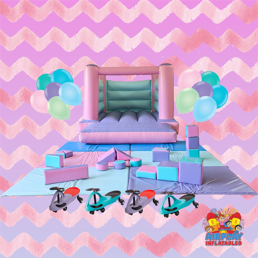 Pastel Bouncy Castle: A gorgeous 15x11ft inflatable castle in soft, soothing shades, designed for safe, bouncy fun for all ages. With its beautiful colours, it’s sure to be the centrepiece of your event!