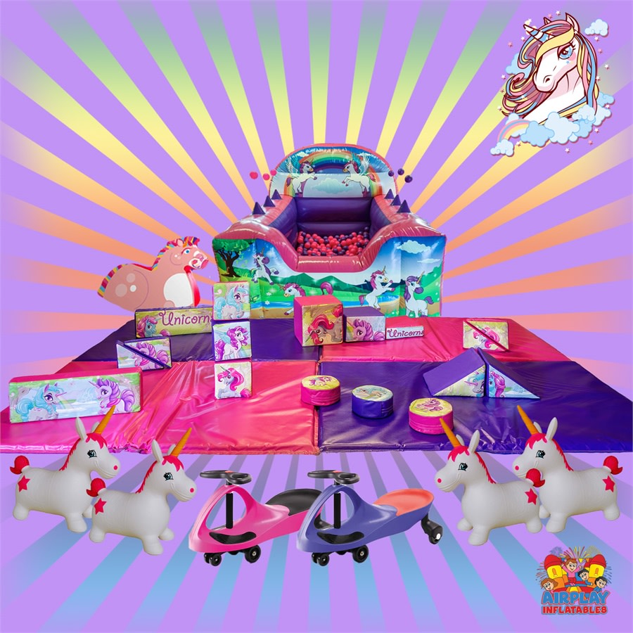 Our premium Unicorn themed soft play package is the best of the best. The package features items not found in similar packages from our competitors, such as a larger ball pit with air jugglers, large step 'n' slide and a Unicorn soft stackable. This soft play package is the perfect choice when a bouncy castle is not required or in halls where celling height is a limiting factor. Ideal for age groups 1 - 5 yrs.