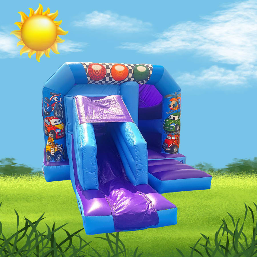 Get ready to rev up the fun at your next celebration with our Transport Disco Bouncy Castle Combo! 🎉 This 18x12ft bouncy castle features a vibrant transport-themed design complete with cars 🚗, diggers 🚜, motorcycles 🏍️, fire engines 🚒, and helicopters 🚁 that will dazzle and delight kids of all ages. The bright purple and blue colours add an extra pop of excitement to any event!