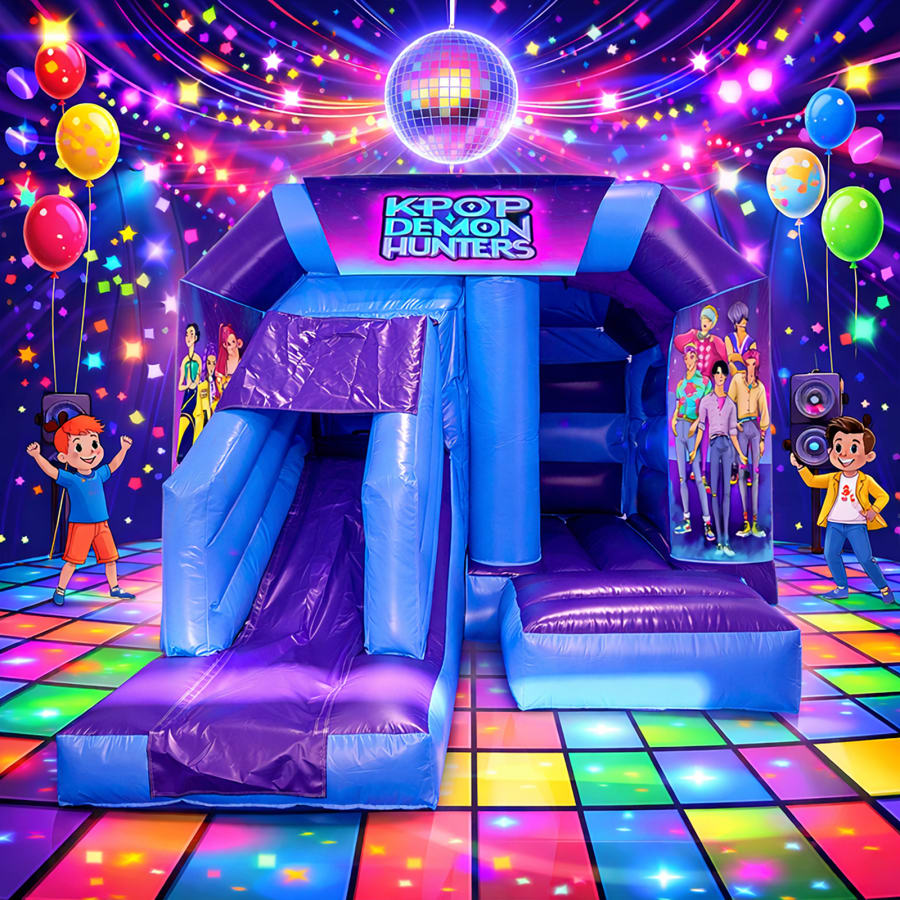 Bring the ultimate party vibe to your event with our KPop Demon Hunters Disco Bouncy Castle with Slide! Designed in eye-catching purple and light blue, this inflatable is perfect for fans of K-pop, pop culture, and high-energy fun.
