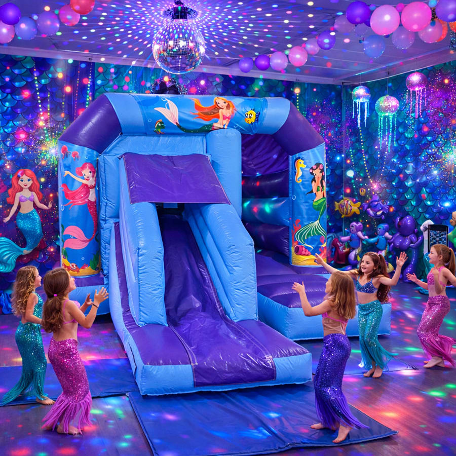 Whether you're hosting a birthday party, corporate event, or family gathering, our Mermaids Disco Bouncy Castle Combo is sure to be a hit. Contact us today to book this fantastic inflatable for your next event and make it a celebration to remember!