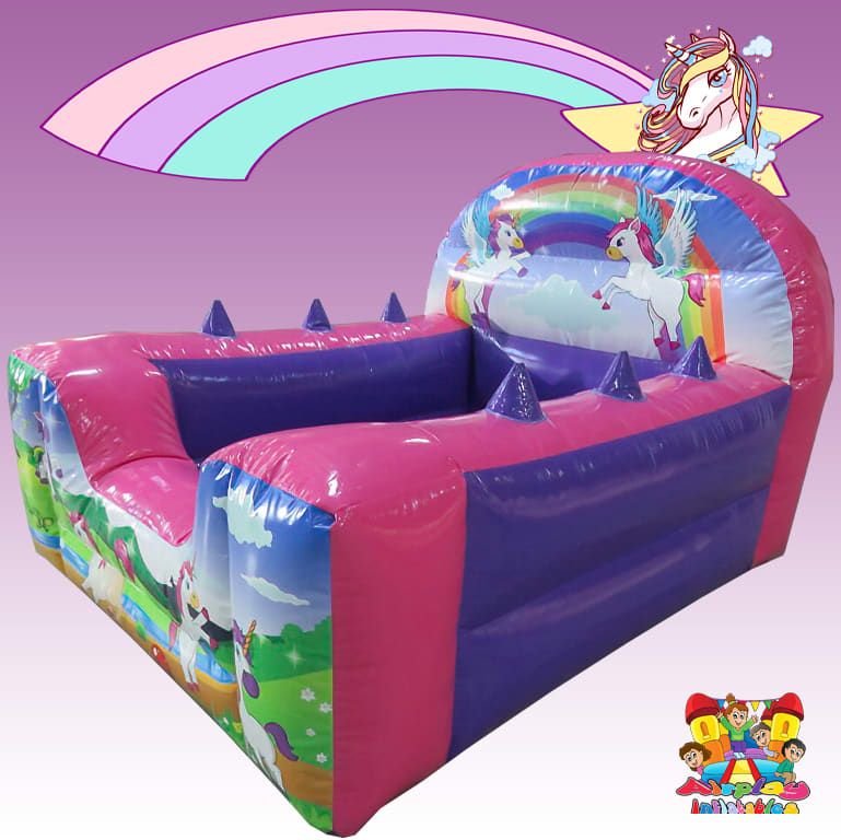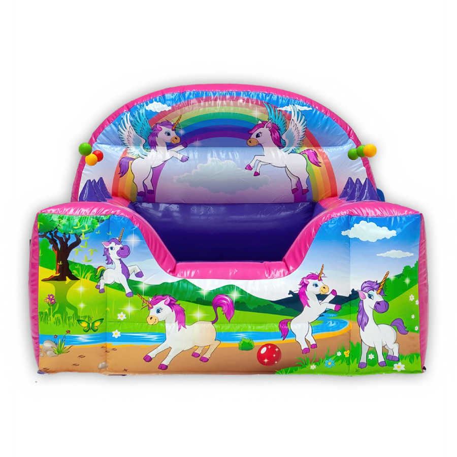 This fantastic unicorn themed ball pond holds over 1000 balls and features 6 air jugglers. Your little ones will use all their skills to move the floating balls along the air jugglers keeping them occupied for hours! Our unicorn ball pond is a great add on when hiring any of our unicorn bouncy castles and soft play.