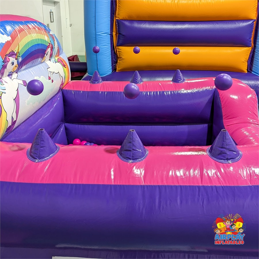 • Unicorn Themed 3D Bouncy Castle with stunning unicorn heads, contoured front arch, built-in slide and mesh sides for safety