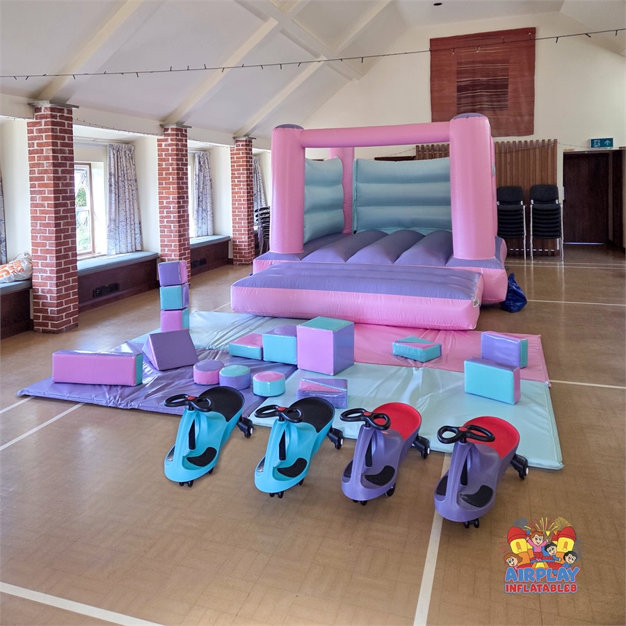 Pastel Bouncy Castle: A gorgeous 15x11ft inflatable castle in soft, soothing shades, designed for safe, bouncy fun for all ages. With its beautiful colours, it’s sure to be the centrepiece of your event!